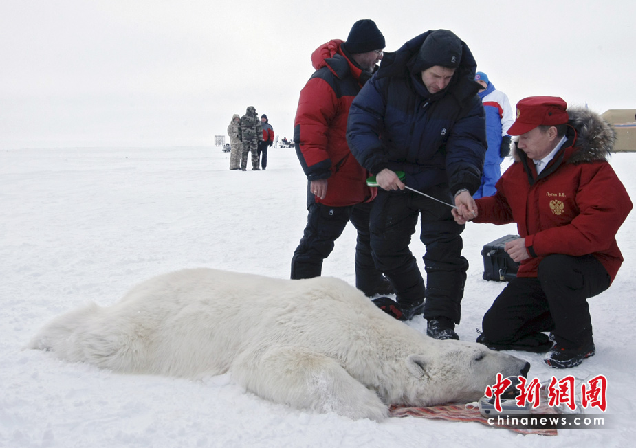 4月29日,俄羅斯總理普京參觀亞歷山大地島(法蘭士約瑟夫地群島)。 普京還與在研究學(xué)者一同給通過(guò)專門的陷阱捕獲的北極熊戴上衛(wèi)星定位項(xiàng)圈。此外,學(xué)者們還與普京一起給北極熊進(jìn)行測(cè)量和秤體重,