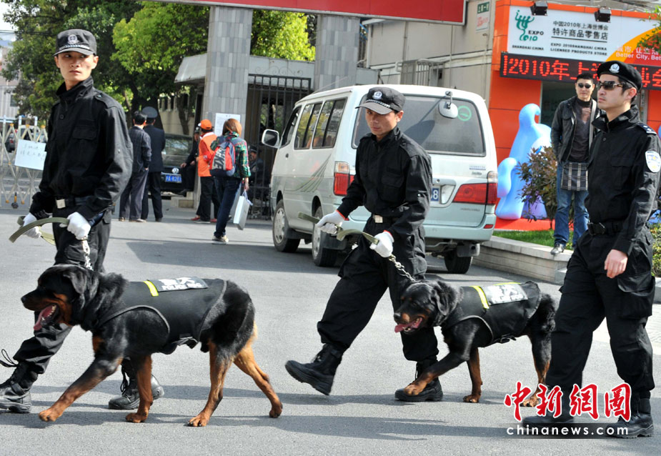 4月30日晚,舉世矚目的上海世博會(huì)開幕式將在黃浦江畔世博園區(qū)舉行。 4月30日上午,上海警察攜警犬在世博園周圍巡邏。中新社發(fā) 賈國榮 攝