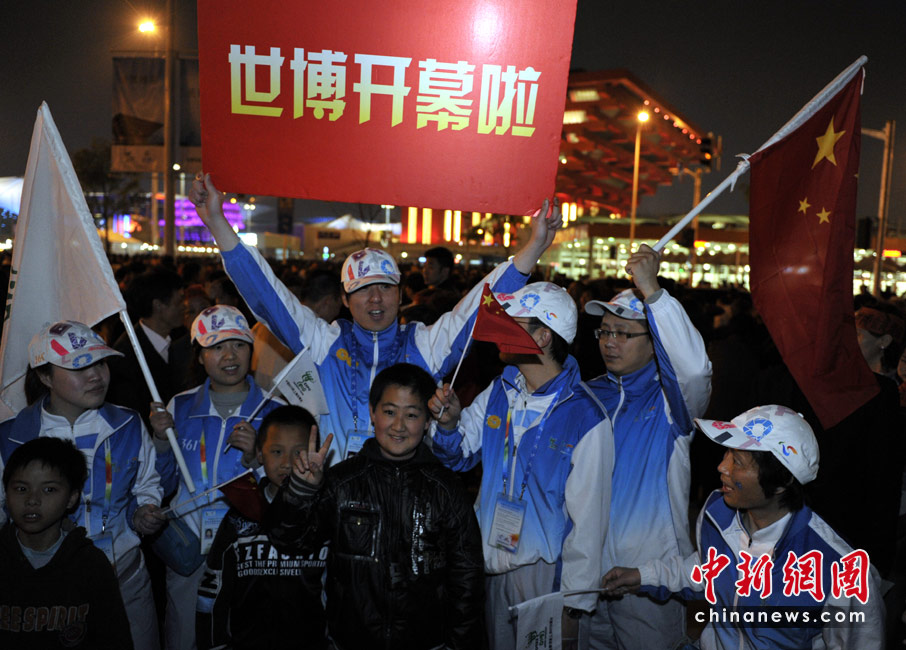 30日晚上8時(shí),2010年上海世博會(huì)正式拉開(kāi)帷幕。上海周家渡動(dòng)遷居民和志愿者在中國(guó)館前打出“世博開(kāi)幕啦”的大牌子,高喊:“世博開(kāi)幕啦!我們開(kāi)心死啦!”中新網(wǎng)記者 王紅綱 攝