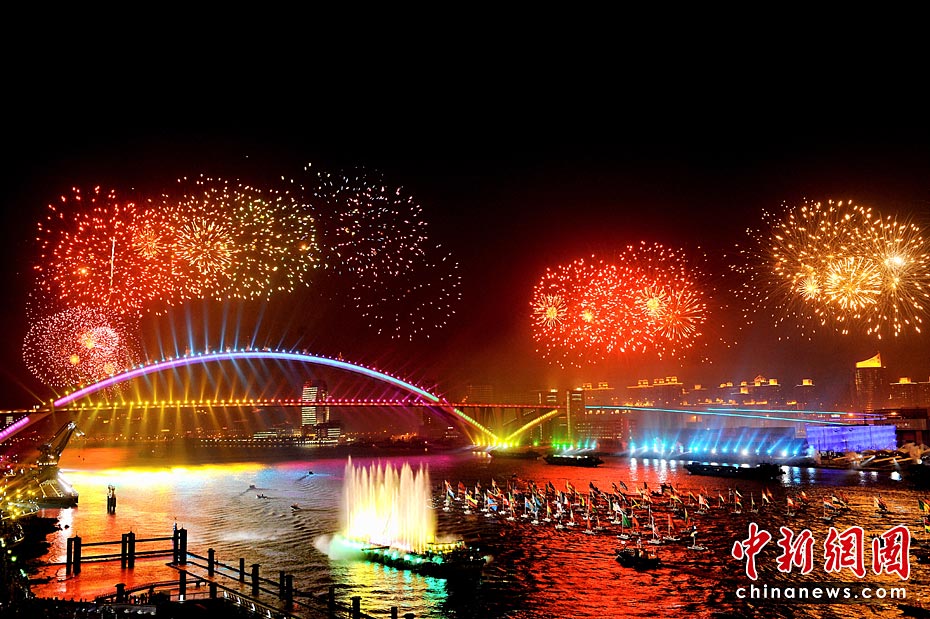4月30日晚,中國2010年上海世博會開幕式大型燈光噴泉焰火表演在上海舉行。圖片來源:中國新聞網(wǎng)