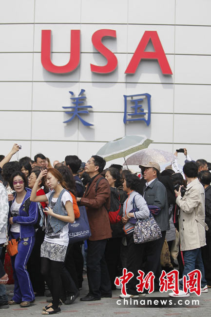 5月1日,上海世博會正式開園迎客,首批游客入園參觀。圖為在美國館外排隊的游客。