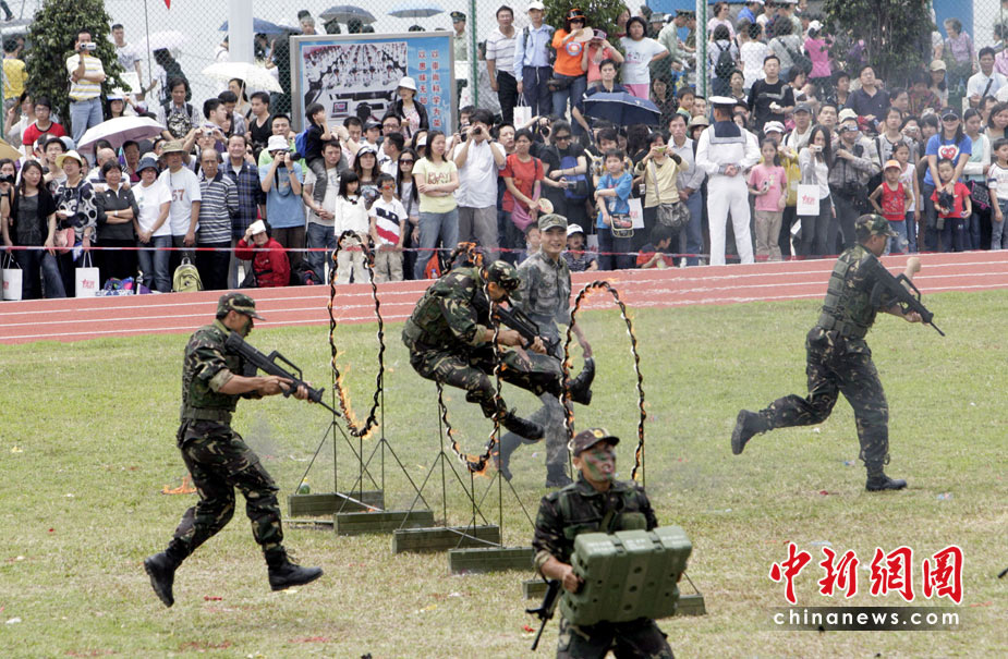 為慶祝“五一”國際勞動節(jié),進(jìn)一步增進(jìn)與香港社會各界相互溝通與交流,中國人民解放軍駐香港部隊(duì)5月1日開放了昂船洲軍營,圖為“獵人戰(zhàn)斗”表演。中新社發(fā) 張勤 攝