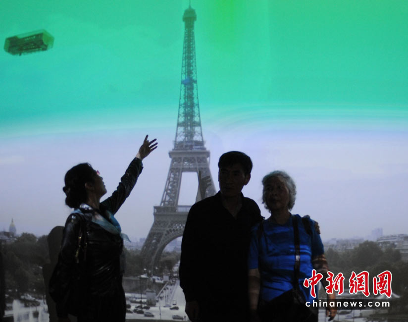 5月2日,上海世博園內(nèi),中國游客在法國館親密接觸艾菲爾鐵塔影像。中新社發(fā) 廖攀 攝