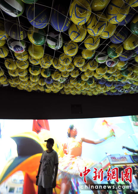 5月2日,上海世博園巴西館,一個(gè)小觀眾在播放著桑巴熱舞的環(huán)形屏幕前留影。這個(gè)放映廳的天花板是由幾千個(gè)足球組成,盡顯“桑巴王國(guó)”、“足球王國(guó)”的風(fēng)采。 中新網(wǎng)記者 王紅綱 攝