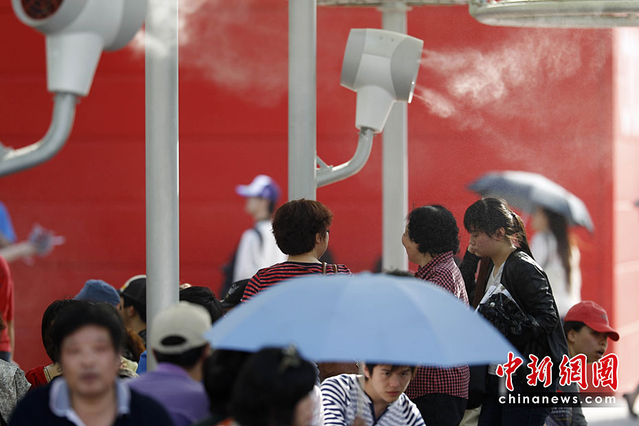 2010年5月2日,上海世博園區(qū)啟動(dòng)各項(xiàng)控溫降溫設(shè)施應(yīng)對(duì)高溫。圖為游客休息區(qū)內(nèi)啟動(dòng)噴霧降溫系統(tǒng)。中新社記者 盛佳鵬 攝