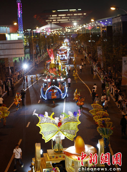 5月2日晚,由一輛輛充滿異域風(fēng)情的花車和身著盛裝的表演者組成的“歡樂盛裝大巡游”在世博園區(qū)舉行。中新網(wǎng)記者 盛佳鵬 攝