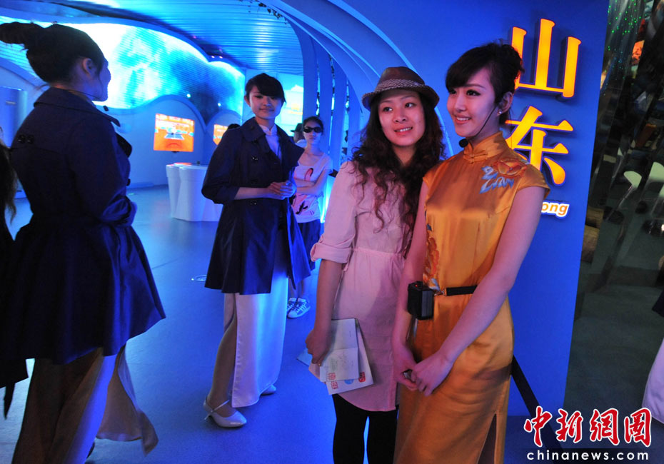 5月3日,上海世博會中國山東館一位禮儀小姐始終笑容可掬,許多參觀者都喜歡與外秀內(nèi)慧的她拍一張留影照。當(dāng)一對夫婦推著嬰兒車經(jīng)過時,她迅速上前幫助抬下階梯。她因而享有全場最善解人意的禮儀小姐美稱。中新社發(fā) 賈國榮 攝