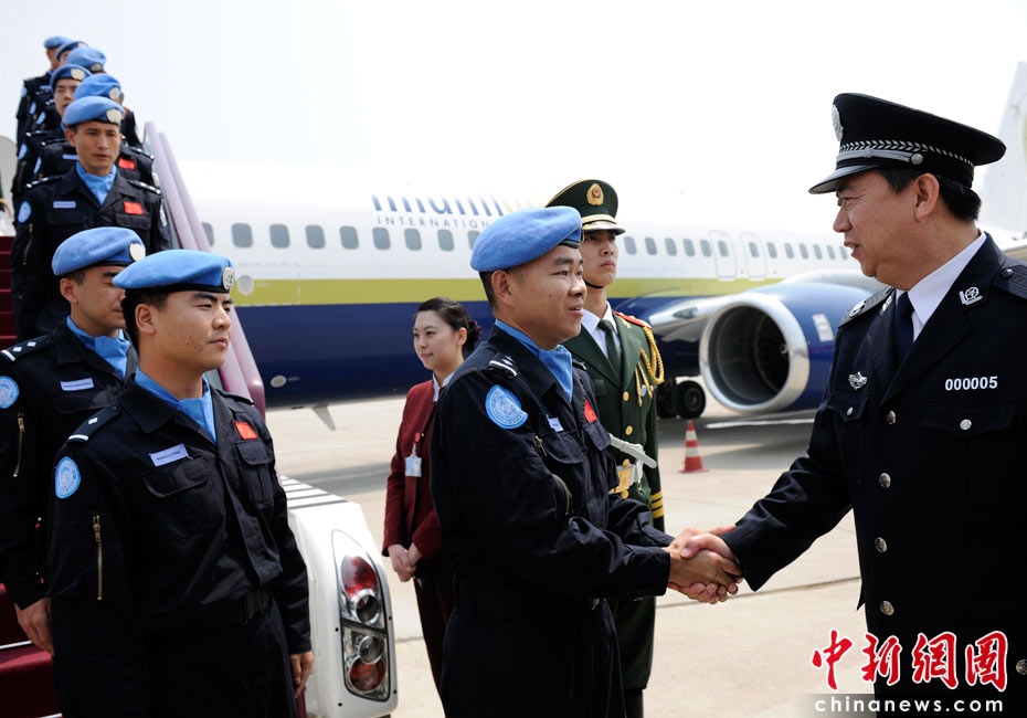 5月4日,中國第八支赴海地維和警察防暴隊全體隊員乘坐聯(lián)合國包機返回祖國。公安部副部長孟宏偉、政治部主任蔡安季前往機場迎接。 中新社發(fā) 劉震 攝