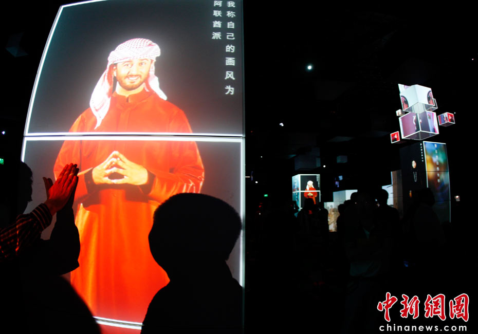 2010年5月4日,上海世博園區(qū)內的阿聯(lián)酋館,虛擬解說員為游客介紹阿聯(lián)酋的歷史、文化等。中新社發(fā) 盛佳鵬 攝