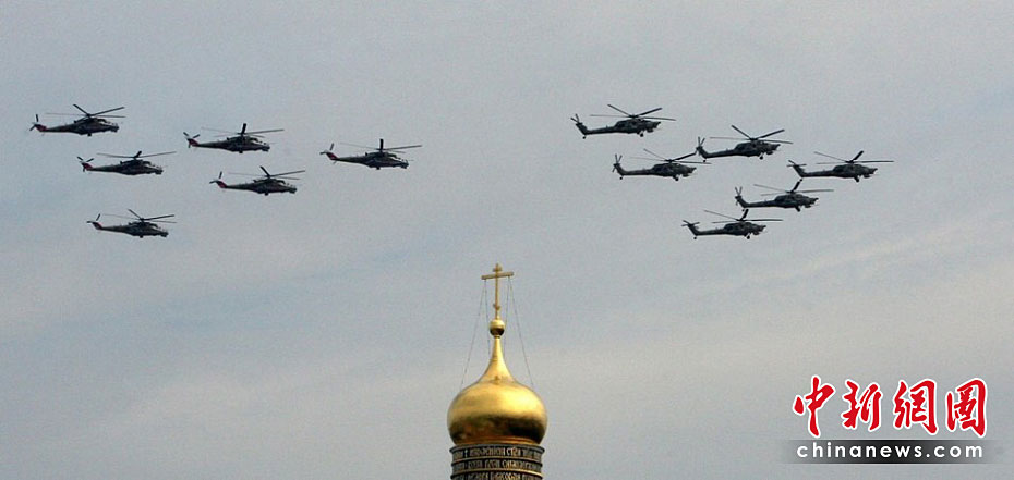 當(dāng)?shù)貢r間5月4日,在俄羅斯首都莫斯科,參加彩排的戰(zhàn)機編隊飛過紅場上空。俄羅斯將于5月9日隆重紀念衛(wèi)國戰(zhàn)爭勝利65周年。圖片來源:中國新聞網(wǎng)