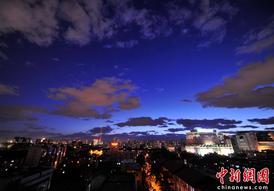 5月5日立夏,京城降雨今晨剛剛結(jié)束,霧氣伺機(jī)又起。傍晚時(shí)分,隨著四級(jí)北風(fēng)的到來,京城天氣逐漸轉(zhuǎn)晴,霧氣慢慢消散天空彤云密布夜色瑰麗。中新網(wǎng)記者 金碩 攝