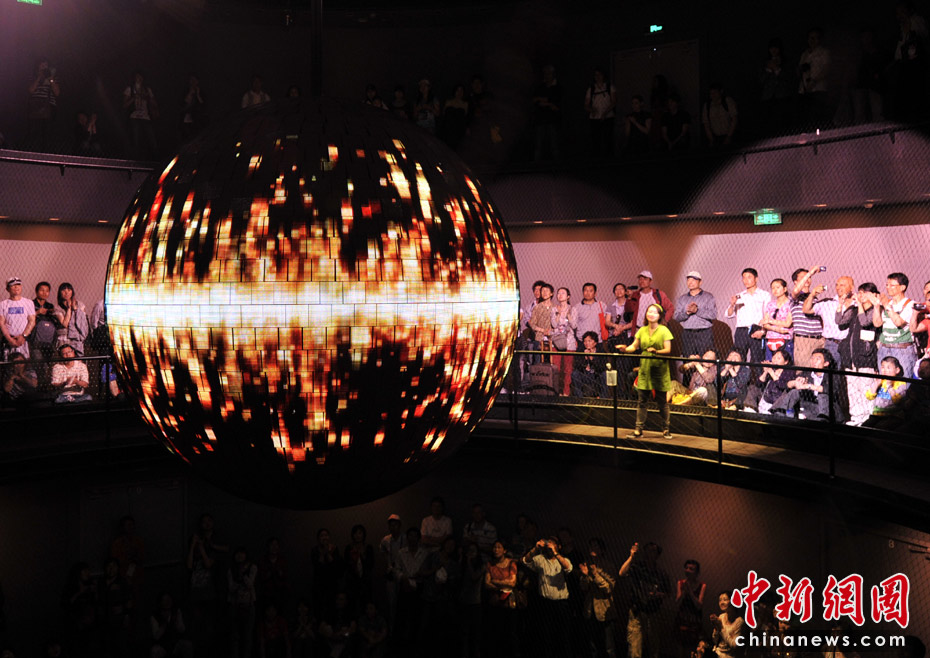 德國(guó)館的高潮就是它的最后部分“動(dòng)力之源”?梢匀菁{600人的動(dòng)力之源大廳圓形環(huán)廊是一個(gè)圓錐形空間,中間懸掛著一個(gè)重達(dá)1.5噸、直徑達(dá)3米的巨大金屬球,四周則有一圈供游客駐足的走廊。黑漆漆的大廳里,兩個(gè)虛擬主持人邀請(qǐng)觀眾同時(shí)大聲吶喊。隨著吶喊聲的加大,動(dòng)力球慢慢擺動(dòng)起來(lái),聲音越大擺動(dòng)幅度越大,甚至繞圈飛行。圓球表面40萬(wàn)根發(fā)光的LED管,逐漸閃現(xiàn)出德國(guó)人對(duì)未來(lái)城市生活的暢想畫(huà)面。這是一場(chǎng)7分鐘的互動(dòng)體驗(yàn)。在這里觀眾才是主角。中新網(wǎng)記者 王紅綱 攝