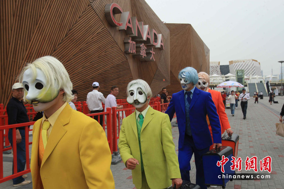 5月6日,幾位穿著艷麗服裝的“藝術家”,走進世博會加拿大館,這是加拿大館的文化推廣內(nèi)容之一。中新社發(fā) 潘索菲 攝