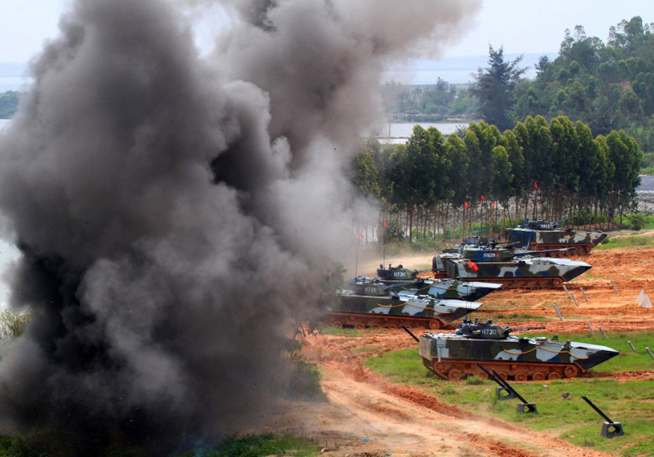 登陸作戰(zhàn)實(shí)兵實(shí)彈演練。圖片來源:新華網(wǎng) 查春明攝