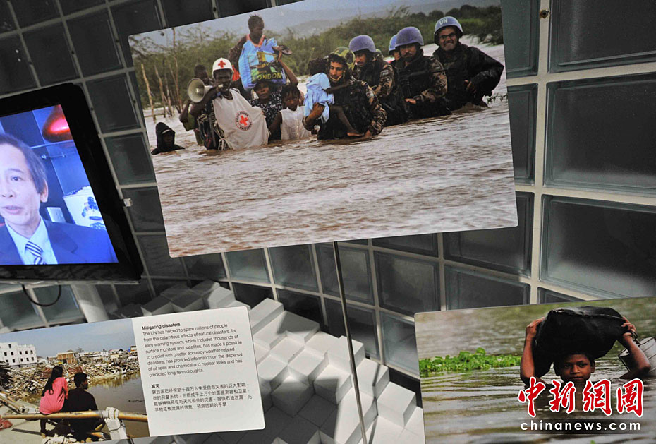 一所藍色的簡樸平房,在5月開園的上海世博會大道邊上,極不顯眼。但是,聯(lián)合國聯(lián)合館的鮮明會標,特別吸引人。這個展館集中了世界衛(wèi)生組織、世界銀行和聯(lián)合國的兒童基金會、糧農(nóng)組織、教科文組織等22個機構(gòu)。圖片來源:中國新聞網(wǎng) 賈國榮 攝