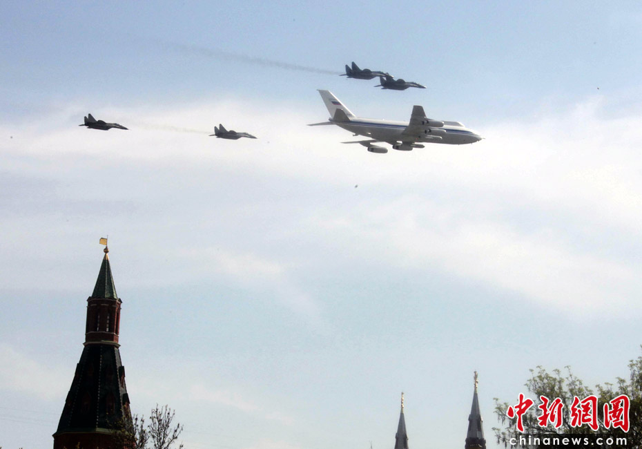 5月9日,俄羅斯在莫斯科紅場(chǎng)舉行盛大的閱兵式,慶祝衛(wèi)國(guó)戰(zhàn)爭(zhēng)勝利65周年。莫斯科時(shí)間5月9日上午10點(diǎn)(北京時(shí)間9日下午2點(diǎn))許,閱兵式正式開(kāi)始。圖為空中梯隊(duì)飛越紅場(chǎng)上空。中新網(wǎng)記者 張朔 攝