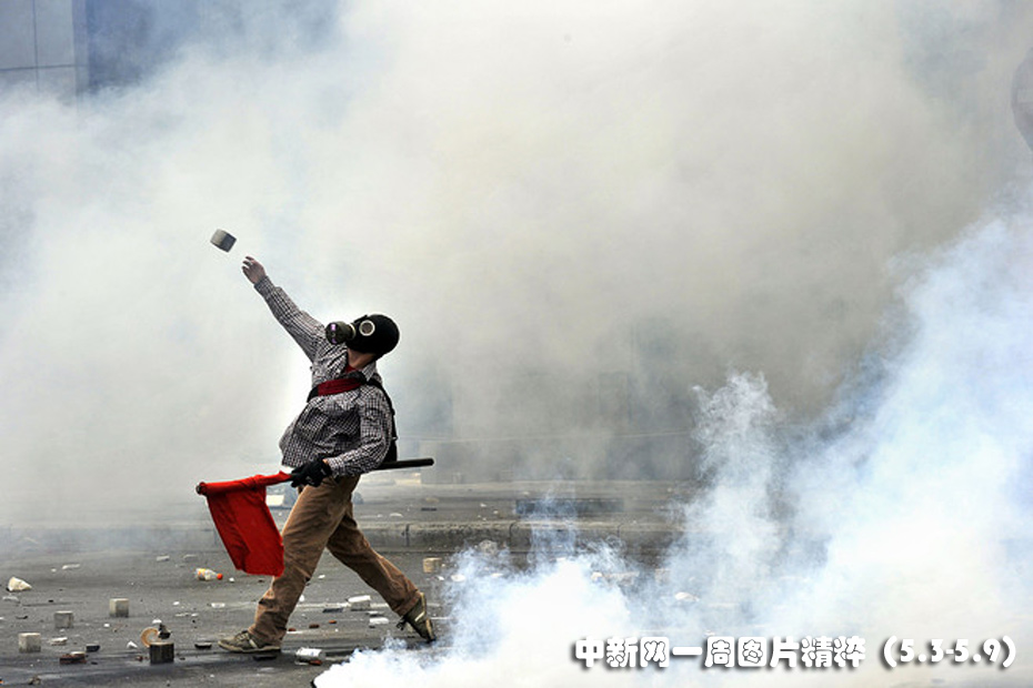 5月5日周三,在雅典的國(guó)會(huì)大樓附近,一名抗議者朝警察擲石塊。