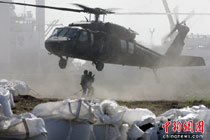 5月11日,美國(guó)路易斯安那州,國(guó)民警衛(wèi)隊(duì)用直升機(jī)向河口運(yùn)載沙袋,試圖阻止海上的油污進(jìn)入內(nèi)河。