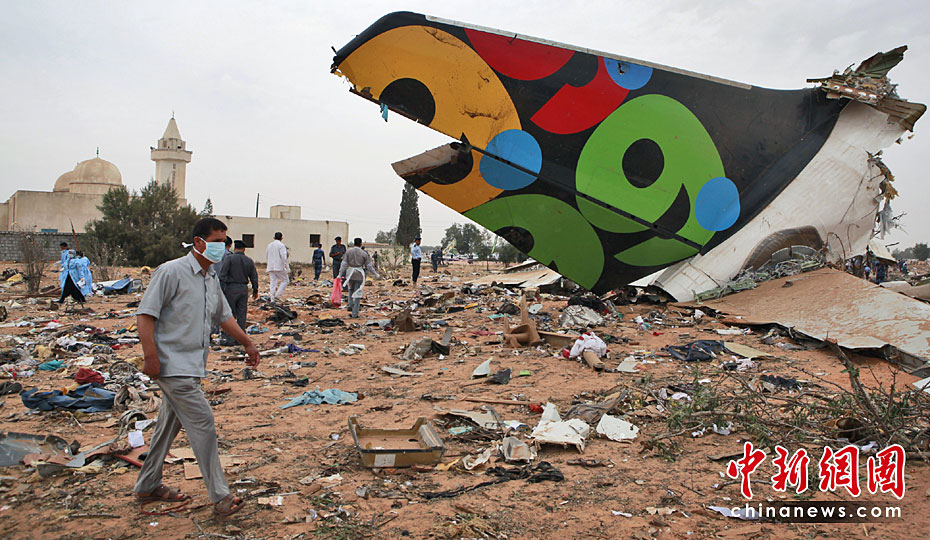 5月12日,一架從南非起飛的利比亞航班在利比亞首都的黎波里機(jī)場墜毀,機(jī)上103名乘客和機(jī)組人員遇難。圖片來源:中國新聞網(wǎng)