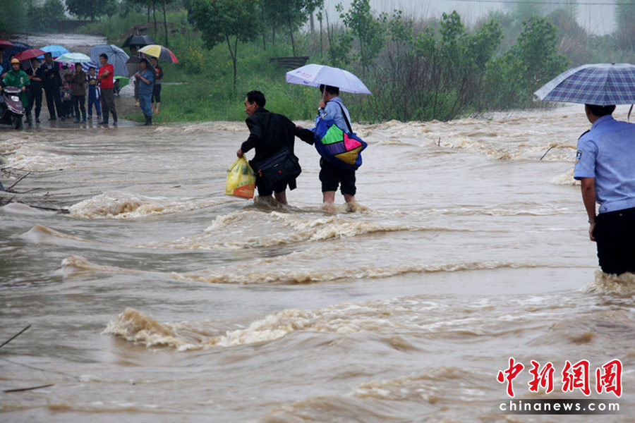 2010年5月18日,江西省婺源縣太白鎮(zhèn)朱村村民在當(dāng)?shù)毓哺删淖o(hù)送下通過被淹公路橋。當(dāng)日,江西全省近50個(gè)縣出現(xiàn)普降暴雨,其中婺源縣、 降雨量以婺源縣153毫米為最大,當(dāng)?shù)匾丫o急轉(zhuǎn)移群眾4000余人。到筆者發(fā)稿止,在該縣太白鎮(zhèn)通往德興市的主要公路被迫中斷,樂安河太白段水位均已超出警界線。卓忠偉/CFP