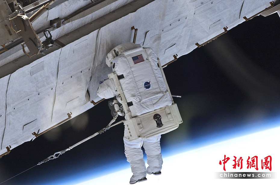 美國當?shù)貢r間5月17日,“亞特蘭蒂斯”號航天飛機宇航員加雷特·賴斯曼和史蒂夫·鮑恩進行了與國際空間站對接后的首次太空行走。圖片來源:中國新聞網