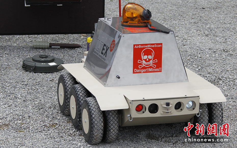 當(dāng)?shù)貢r間5月18日,德國南部哈默爾堡舉行了歐洲軍用機(jī)器人大賽。歐洲各國軍用機(jī)器人在大賽上一展身手。圖片來源:中國新聞網(wǎng)