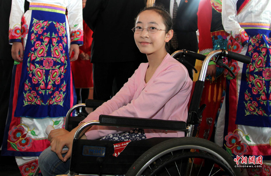 5月24日下午,“四川省感謝臺(tái)灣社會(huì)各界援助‘5.12’地震災(zāi)區(qū)見(jiàn)面會(huì)”在臺(tái)北舉行,汶川強(qiáng)震中失去一條腿的“芭蕾女孩”李月朗誦詩(shī)歌,向臺(tái)灣同胞致敬。 中新網(wǎng)記者 董會(huì)峰 攝