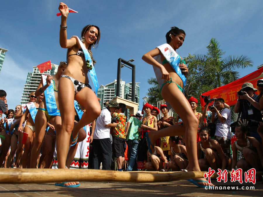5月23日,全球64位比基尼佳麗們參加了三亞“清涼一夏 文化三亞”夏季旅游促銷活動的啟動儀式及系列主題活動,與三亞市民和游客親密接觸,跳起了歡快的竹竿舞,并乘豪華游艇暢游三亞。中新社記者 富田 攝