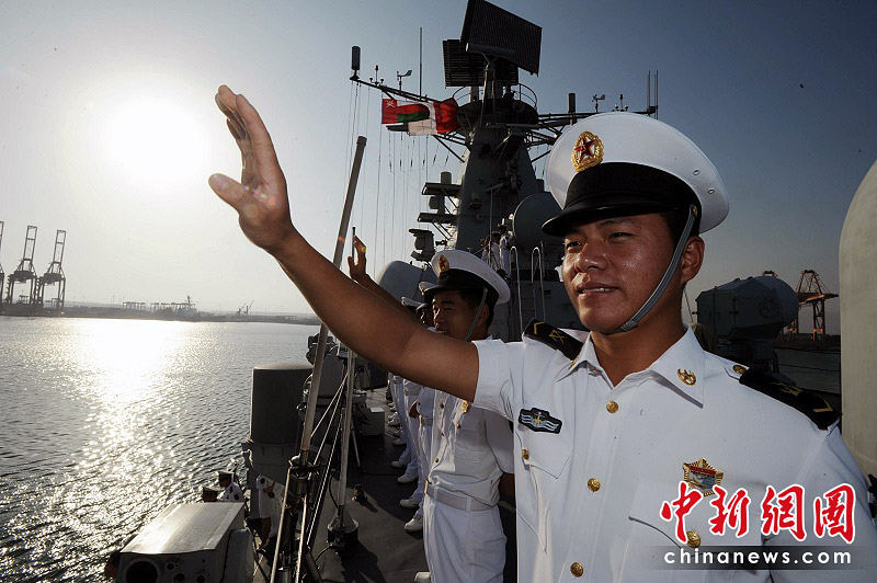 護(hù)航官兵向前來迎接的中國駐阿曼使館官員、海軍先遣組成員、中遠(yuǎn)西亞公司員工等人群揮手致意。江山 攝