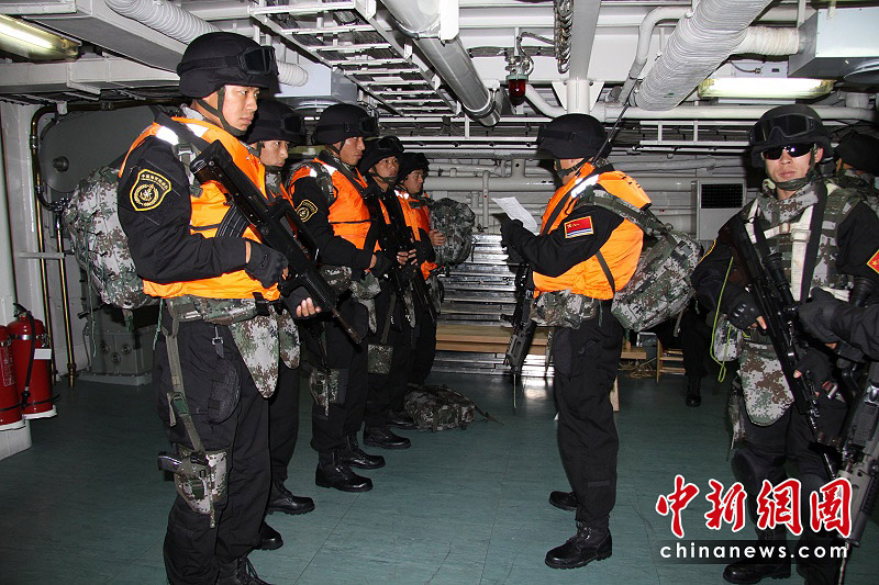 3月7日,新加坡海峽特戰(zhàn)隊(duì)員在船艙中集合。胡軍 攝