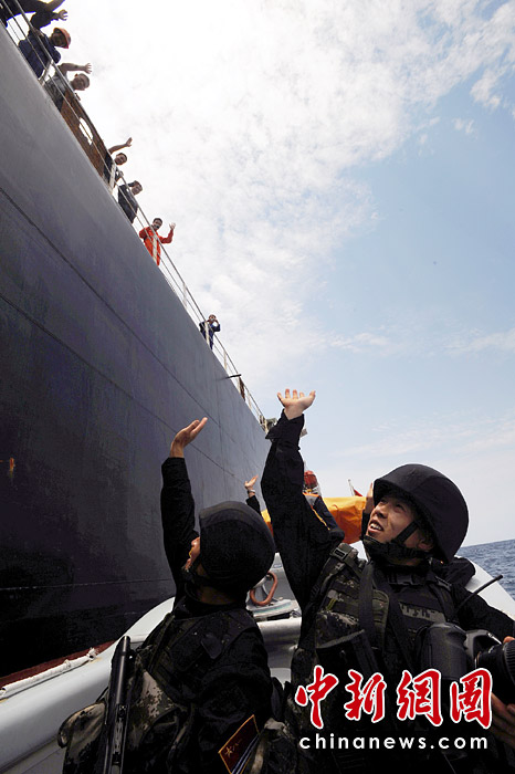 4月16日當地時間11時,第五批護航編隊圓滿完成第188批護航任務,在“嘉永山”輪船實施隨船護衛(wèi)的4名特戰(zhàn)隊員換乘小艇離開時,船員紛紛來到甲板與他們揮手告別。江山 攝