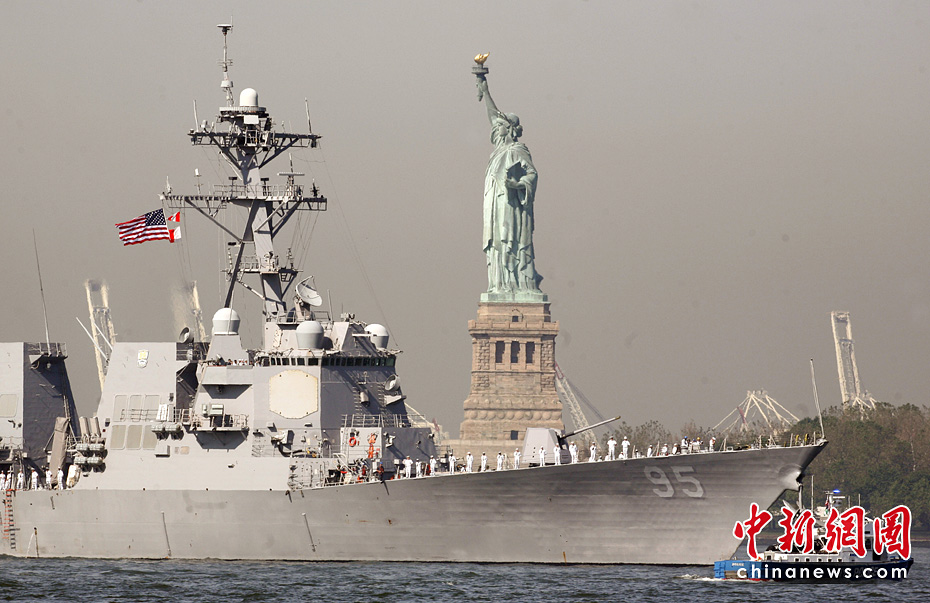 當(dāng)?shù)貢r(shí)間5月26日,美國(guó)第23屆紐約艦隊(duì)周開幕,包括“硫磺島”號(hào)兩棲攻擊艦在內(nèi)的11艘參加艦隊(duì)周活動(dòng)的軍艦由南向北在哈得孫河面上游弋。紐約民眾將以?吭诼D哈得孫河86號(hào)碼頭的“無畏號(hào)”航母博物館為中心,展開為期一周的慶祝和紀(jì)念活動(dòng)。圖片來源:中國(guó)新聞網(wǎng)