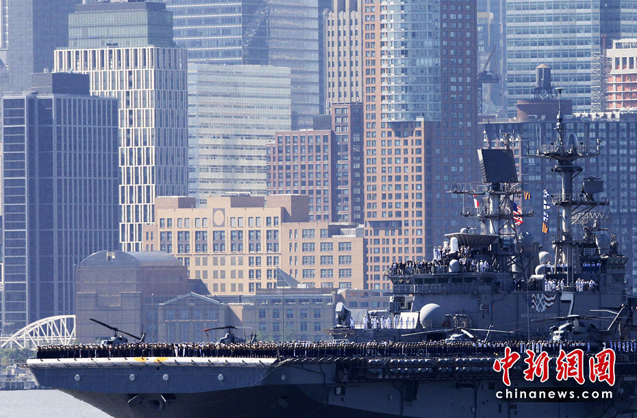 當(dāng)?shù)貢r(shí)間5月26日,美國第23屆紐約艦隊(duì)周開幕,包括“硫磺島”號兩棲攻擊艦在內(nèi)的11艘參加艦隊(duì)周活動(dòng)的軍艦由南向北在哈得孫河面上游弋。紐約民眾將以?吭诼D哈得孫河86號碼頭的“無畏號”航母博物館為中心,展開為期一周的慶祝和紀(jì)念活動(dòng)。圖片來源:中國新聞網(wǎng)