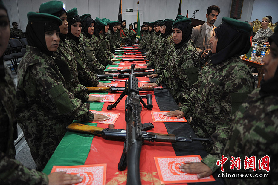 當(dāng)?shù)貢r(shí)間5月27日,阿富汗首批女軍官在首都喀布爾舉行畢業(yè)宣誓儀式。這是阿富汗軍隊(duì)征召女兵計(jì)劃的一部分,按照計(jì)劃她們將根據(jù)各自受教育程度被賦予不同的職位:接受過12年以上教育的女兵將擔(dān)任文職官;接受過9年到11年教育的將擔(dān)任軍士長;受教育程度更低的女兵則只能當(dāng)列兵。圖片來源:中國新聞網(wǎng)