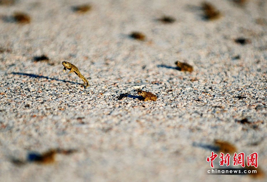 26日,希臘東北部地區(qū)的一條高速公路遭數(shù)百萬只青蛙“占據(jù)”而被迫關(guān)閉了兩個小時。希臘環(huán)保部門表示,這些青蛙可能只是在前往附近小湖找食物過程中“碰巧路過”高速公路。