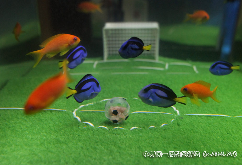 5月23日,日本橫濱八景島海洋世界水族館中,一群魚兒在“踢足球”,藍(lán)色魚代表日本隊(duì),橘色魚代表荷蘭隊(duì)。在2010年南非“世界杯”上,日本將迎戰(zhàn)荷蘭隊(duì)。 圖片來(lái)源:中國(guó)新聞網(wǎng)>>點(diǎn)擊觀看詳細(xì)內(nèi)容