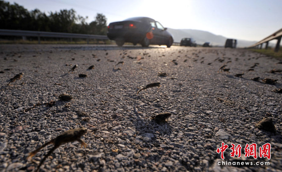 26日,希臘東北部地區(qū)的一條高速公路遭數(shù)百萬只青蛙“占據(jù)”而被迫關(guān)閉了兩個小時。圖片來源:中國新聞網(wǎng)>>點擊觀看詳細內(nèi)容