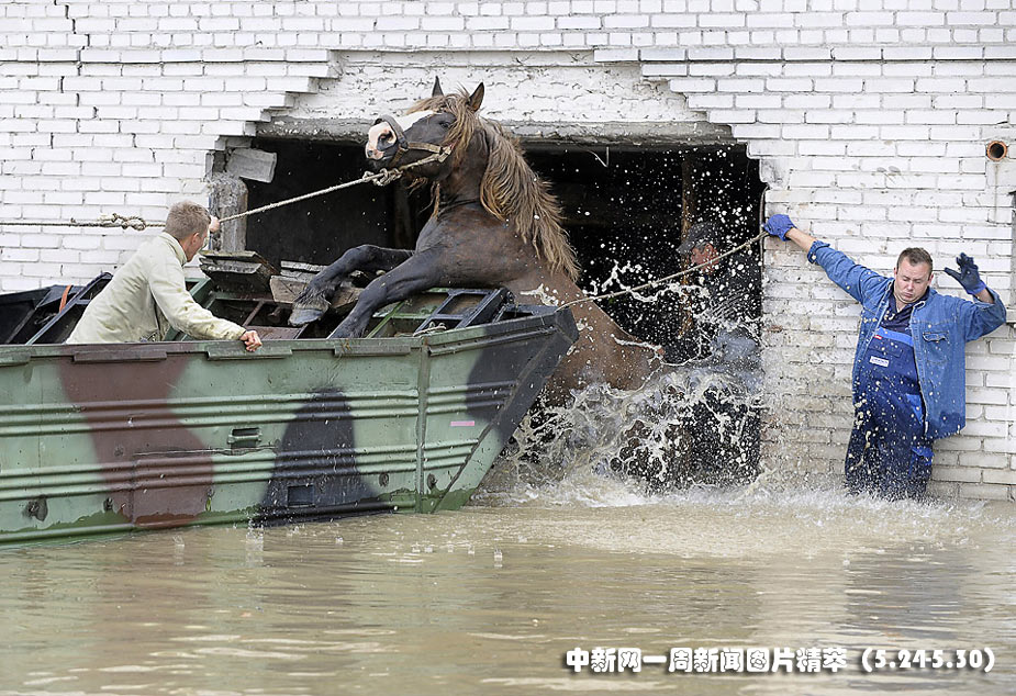 24日(周一),在波蘭Juliszew,農(nóng)民正哄著一匹馬跳進(jìn)兩棲車(chē)。由暴雨引發(fā)的洪水已在波蘭造成至少15人喪生。
