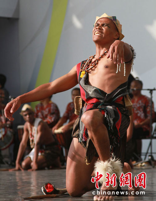 5月30日,馬達加斯加肯特思米諾歌舞團在世博園非洲廣場表演比洛傳統(tǒng)儀式,逼真的神態(tài)、激情的表演,博得許多參觀者稱贊。當天是馬達加斯加館日,世博中心內(nèi)舉行了其國家館日活動,馬方和中方代表共同出席。中新社記者 殷春永 攝