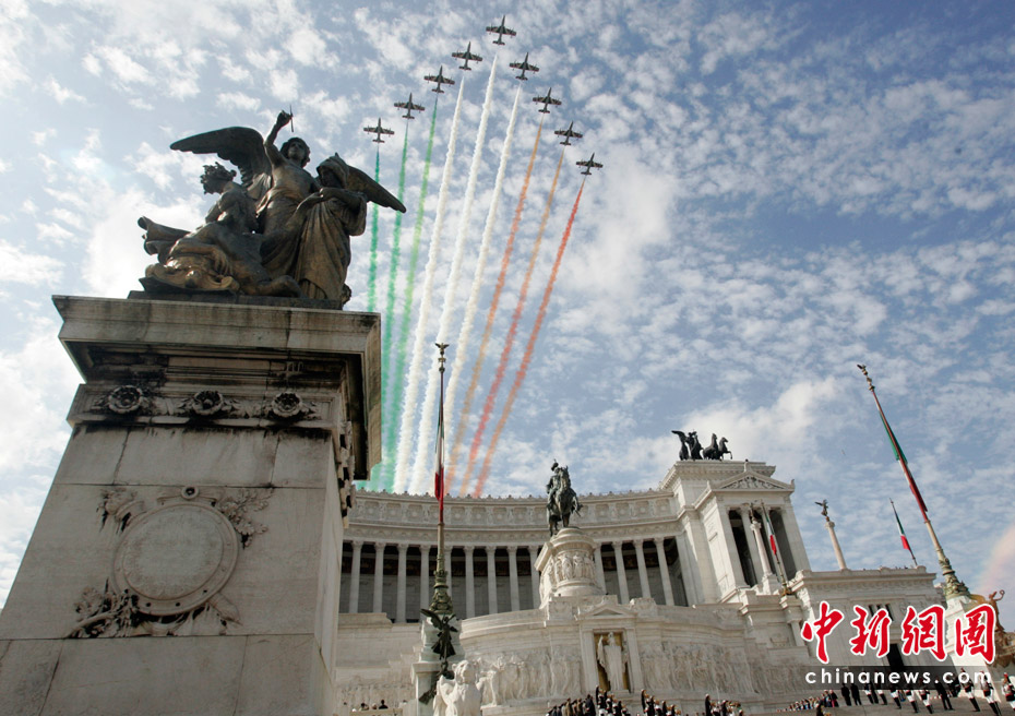 當(dāng)?shù)貢r(shí)間6月2日,意大利首都羅馬舉行盛大儀式慶祝國(guó)慶日。意大利“三色箭”飛行表演隊(duì)在首都上空進(jìn)行了飛行表演。