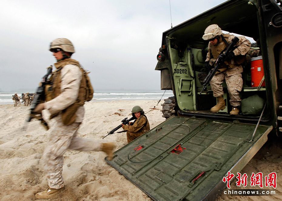 當(dāng)?shù)貢r(shí)間6月4日,約5000名水兵和陸戰(zhàn)隊(duì)員在美國加利福尼亞州舉行了代號為“黎明突擊”的搶灘登陸軍事演習(xí)。圖片來源:中國新聞網(wǎng)