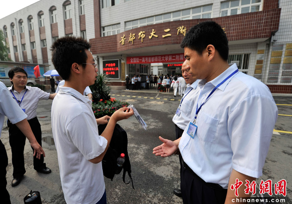 2010年全國(guó)高考6月7日日拉開(kāi)大幕,957萬(wàn)考生走進(jìn)考場(chǎng)。由于報(bào)名人數(shù)減少,而招生計(jì)劃增加,教育部預(yù)計(jì)今年全國(guó)高考平均錄取率將會(huì)增加近7%。圖為首都師范大學(xué)第二附屬中學(xué)考點(diǎn)。中新網(wǎng)記者 金碩 攝