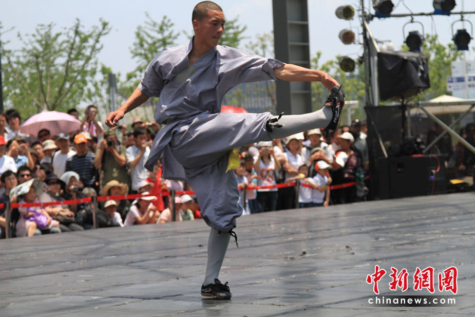 自5月1日開始,上海世博園D片區(qū)綜藝廣場每天都有少林寺功夫展演,受到世博參觀者的熱捧。中新社記者 殷春永攝
