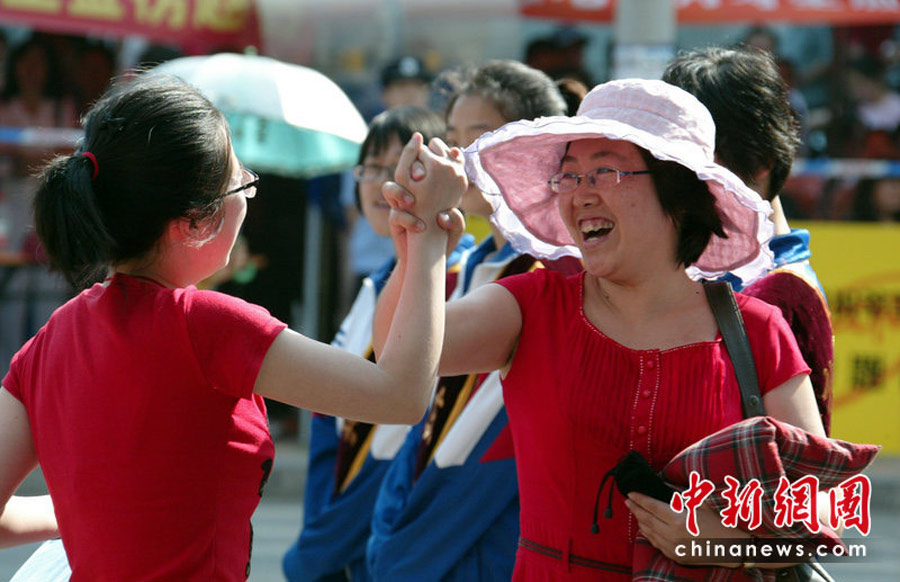 6月7日,為期兩天的2010年普通高等學(xué)校招生全國統(tǒng)一考試開考,全國將有957萬考生走進(jìn)考場(chǎng)。圖為高考第一天,遼寧丹東一中考場(chǎng)外的老師鼓勵(lì)準(zhǔn)備參加考試的學(xué)生獲得好成績。陳浩 攝