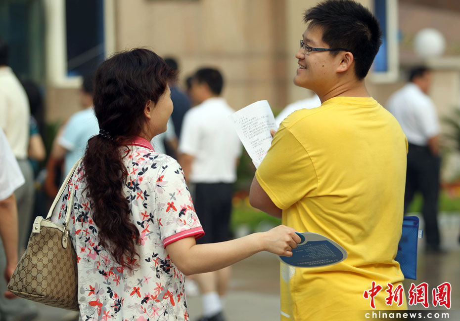 6月7日,為期兩天的2010年普通高等學(xué)校招生全國(guó)統(tǒng)一考試開(kāi)考,全國(guó)將有957萬(wàn)考生走進(jìn)考場(chǎng)。圖為母親為兒子扇風(fēng)降溫。中新社發(fā) 蘇丹 攝