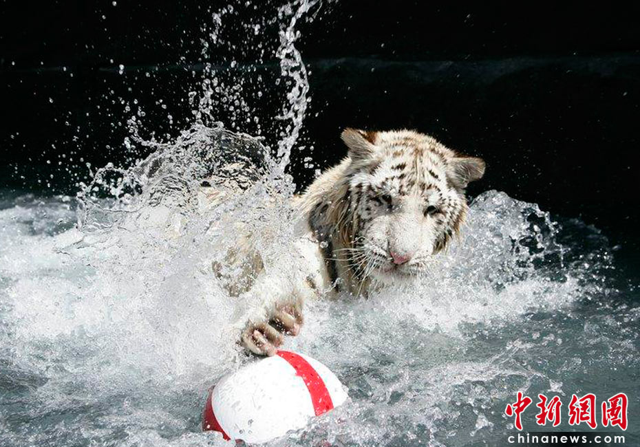 2010年6月7日,美國(guó)南卡羅來(lái)納州美特爾海灘,在世界杯即將開幕之際,一歲的小白虎Sundaram和孟加拉虎Mukti率先在水里上演了一出足球大戲。英格蘭隊(duì)首戰(zhàn)將對(duì)陣美國(guó)隊(duì),因此足球外側(cè)也被印上了英格蘭旗的標(biāo)志。cfp
