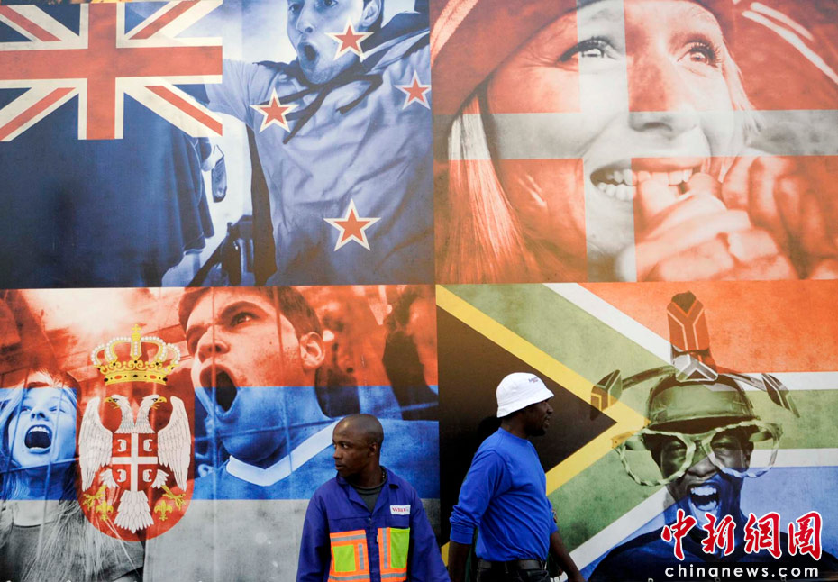 當(dāng)?shù)貢r(shí)間6月9日,民眾在南非約翰內(nèi)斯堡街頭的世界杯宣傳畫(huà)前,非洲大陸即將首次迎來(lái)足球世界杯。中新社發(fā) 廖攀 攝