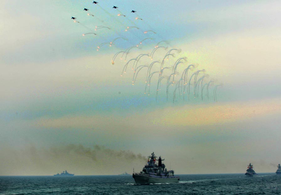中國(guó)歷史上的首次多國(guó)海軍檢閱活動(dòng)四月二十三日下午在青島附近黃海海域舉行。中國(guó)國(guó)家主席、中央軍委主席胡錦濤乘閱兵艦“石家莊”號(hào)導(dǎo)彈驅(qū)逐艦,檢閱中國(guó)海軍的潛艇、水面艦艇、海軍航空兵和海軍陸戰(zhàn)隊(duì)等作戰(zhàn)兵種,并檢閱了來(lái)訪(fǎng)的十四個(gè)國(guó)家的二十一艘艦艇。 中新社發(fā) 宋吉河 攝