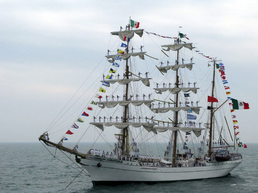 中國(guó)歷史上的首次多國(guó)海軍檢閱活動(dòng)四月二十三日下午在青島附近黃海海域舉行。中國(guó)國(guó)家主席、中央軍委主席胡錦濤乘閱兵艦“石家莊”號(hào)導(dǎo)彈驅(qū)逐艦,檢閱中國(guó)海軍的潛艇、水面艦艇、海軍航空兵和海軍陸戰(zhàn)隊(duì)等作戰(zhàn)兵種,并檢閱了來訪的十四個(gè)國(guó)家的二十一艘艦艇。圖為墨西哥海軍“夸烏特莫克”號(hào)風(fēng)帆訓(xùn)練艦接受檢閱。中新社發(fā) 中新社發(fā) 琥珀旺旺 攝