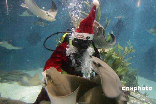 12月13日,上海海洋水族館上演“圣誕老人”海底喂食秀,由潛水員裝扮的圣誕老人在水下進行喂食表演,吸引了眾多游人好奇的目光。中新社發(fā) 湯彥俊 攝